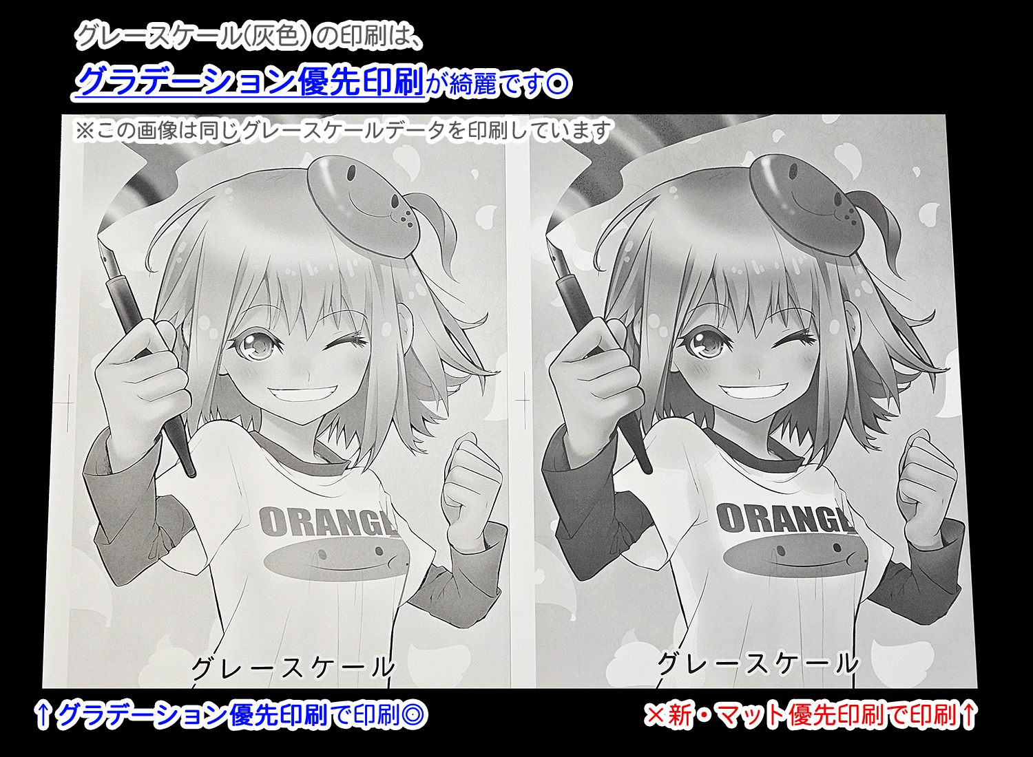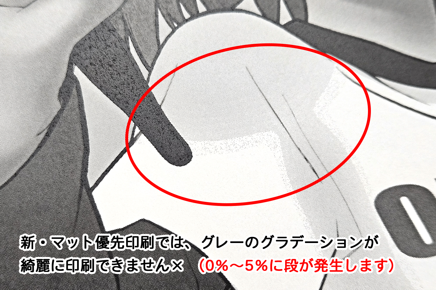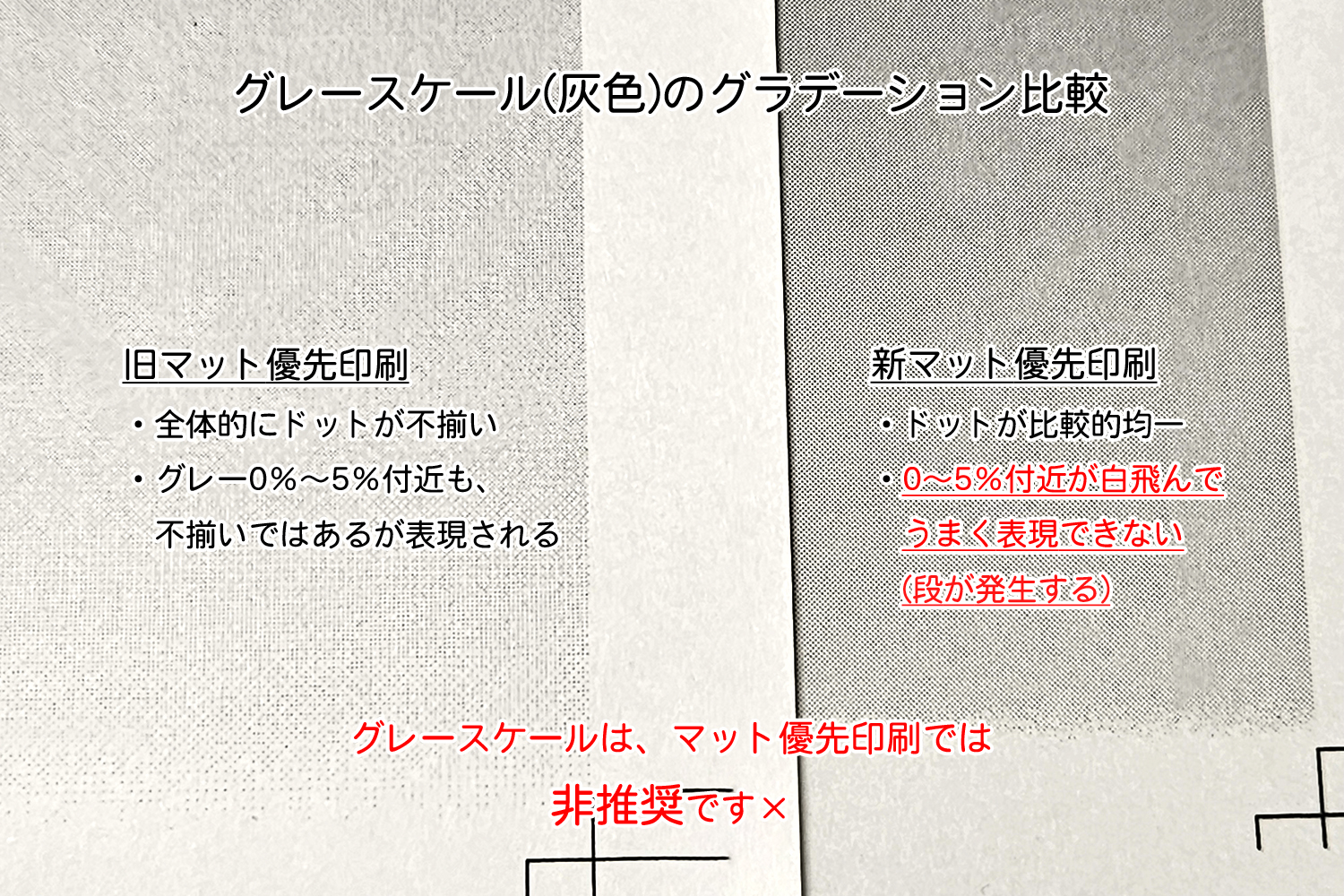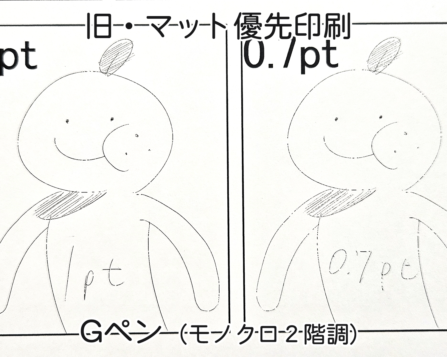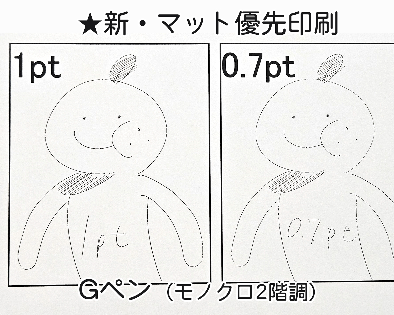 モノクロ2階調の原稿 ⇒ 印刷機の仕様による変化は、ほぼありません。 グレースケールの原稿 (×非推奨) ⇒ 印刷機の仕様により、旧マット優先で印刷した場合と比較して、仕上がりが大幅に変化します。 ※グレースケールを使用した原稿、アンチエイリアスのかかった線やトーンを使用した原稿などは、マット優先印刷非推奨です。