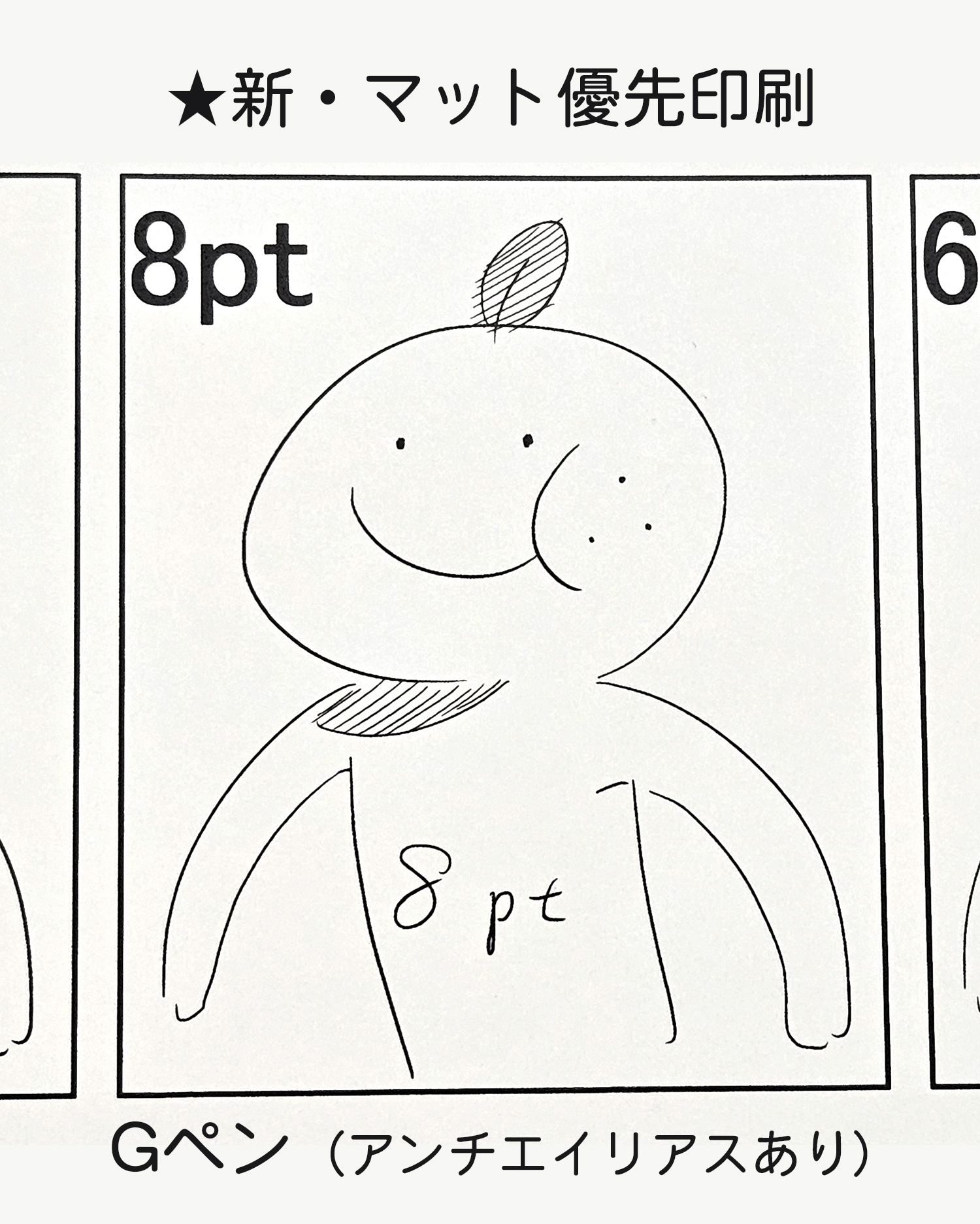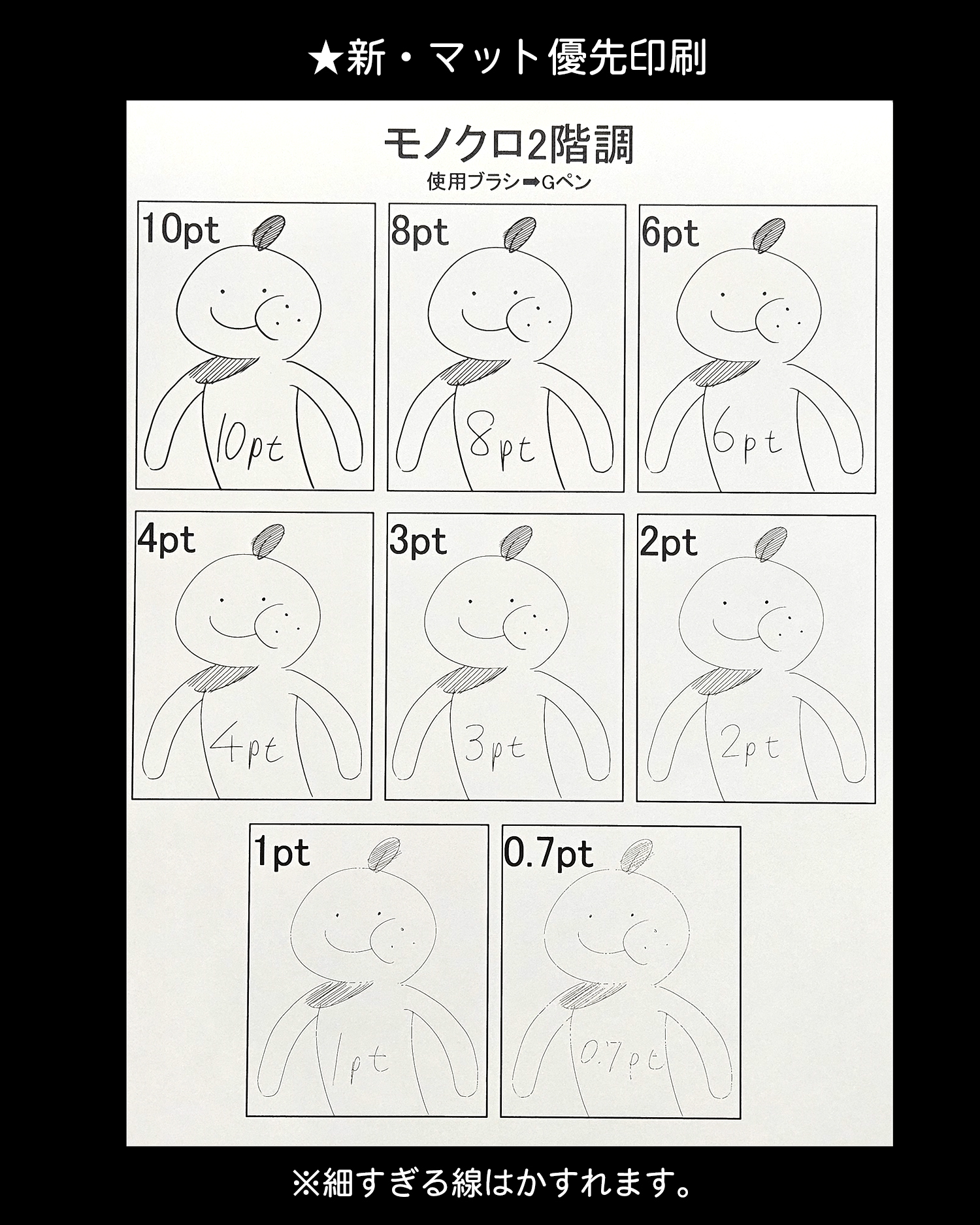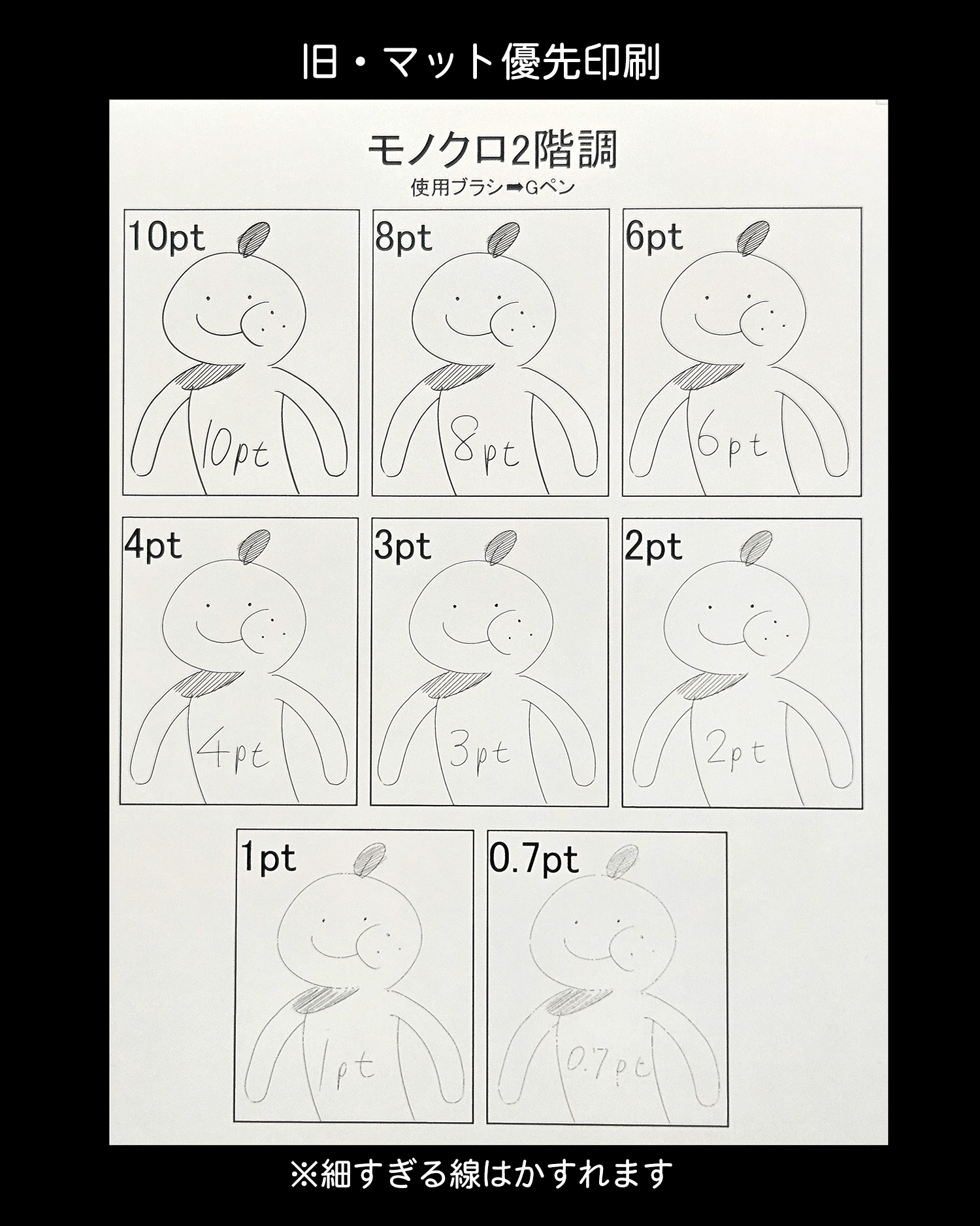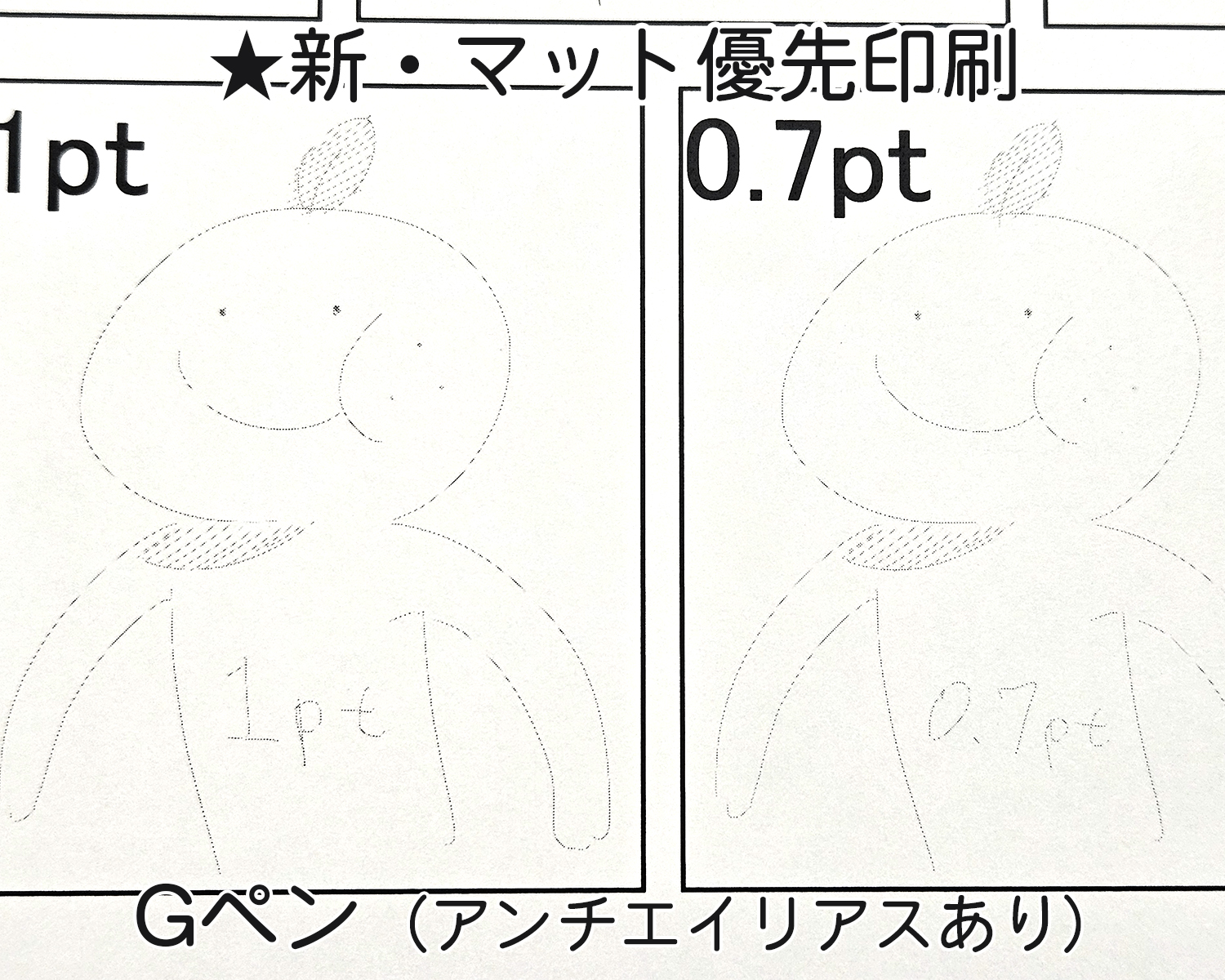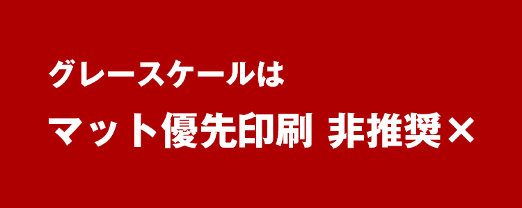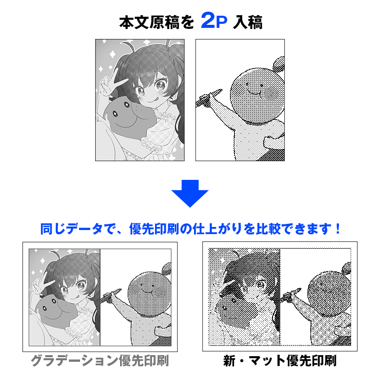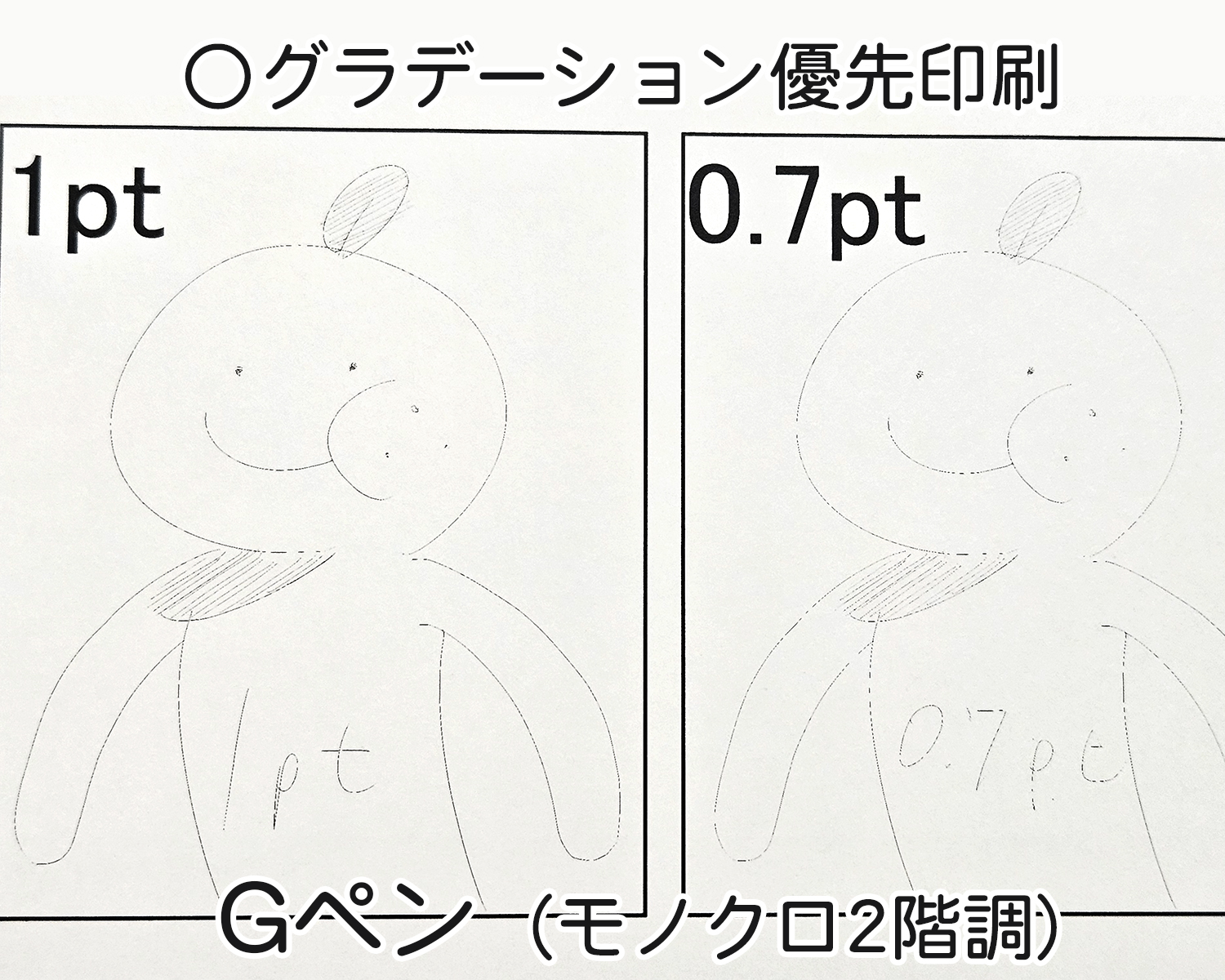 モノクロ2階調の原稿 ⇒ 印刷機の仕様による変化は、ほぼありません。 グレースケールの原稿 (×非推奨) ⇒ 印刷機の仕様により、旧マット優先で印刷した場合と比較して、仕上がりが大幅に変化します。 ※グレースケールを使用した原稿、アンチエイリアスのかかった線やトーンを使用した原稿などは、マット優先印刷非推奨です。