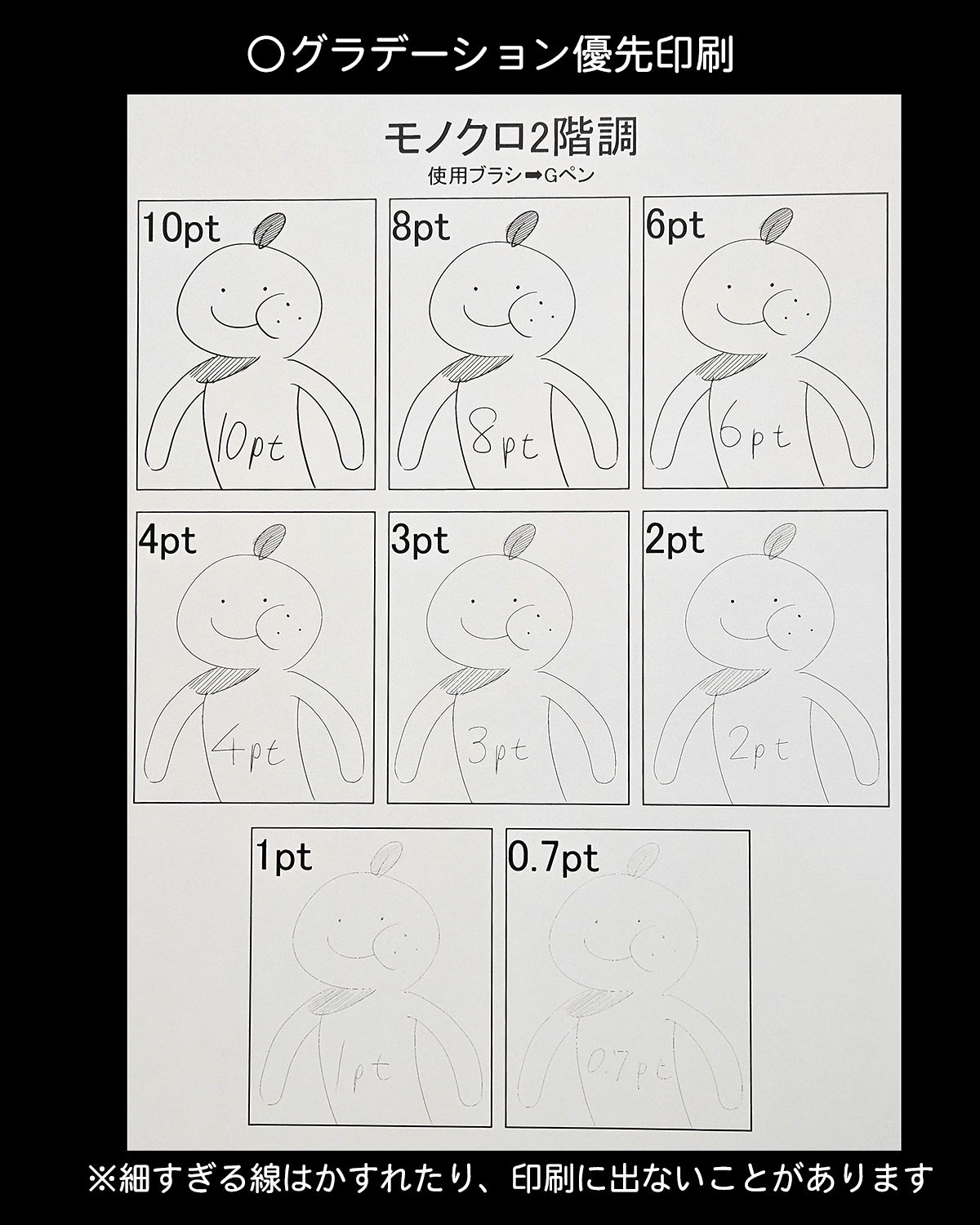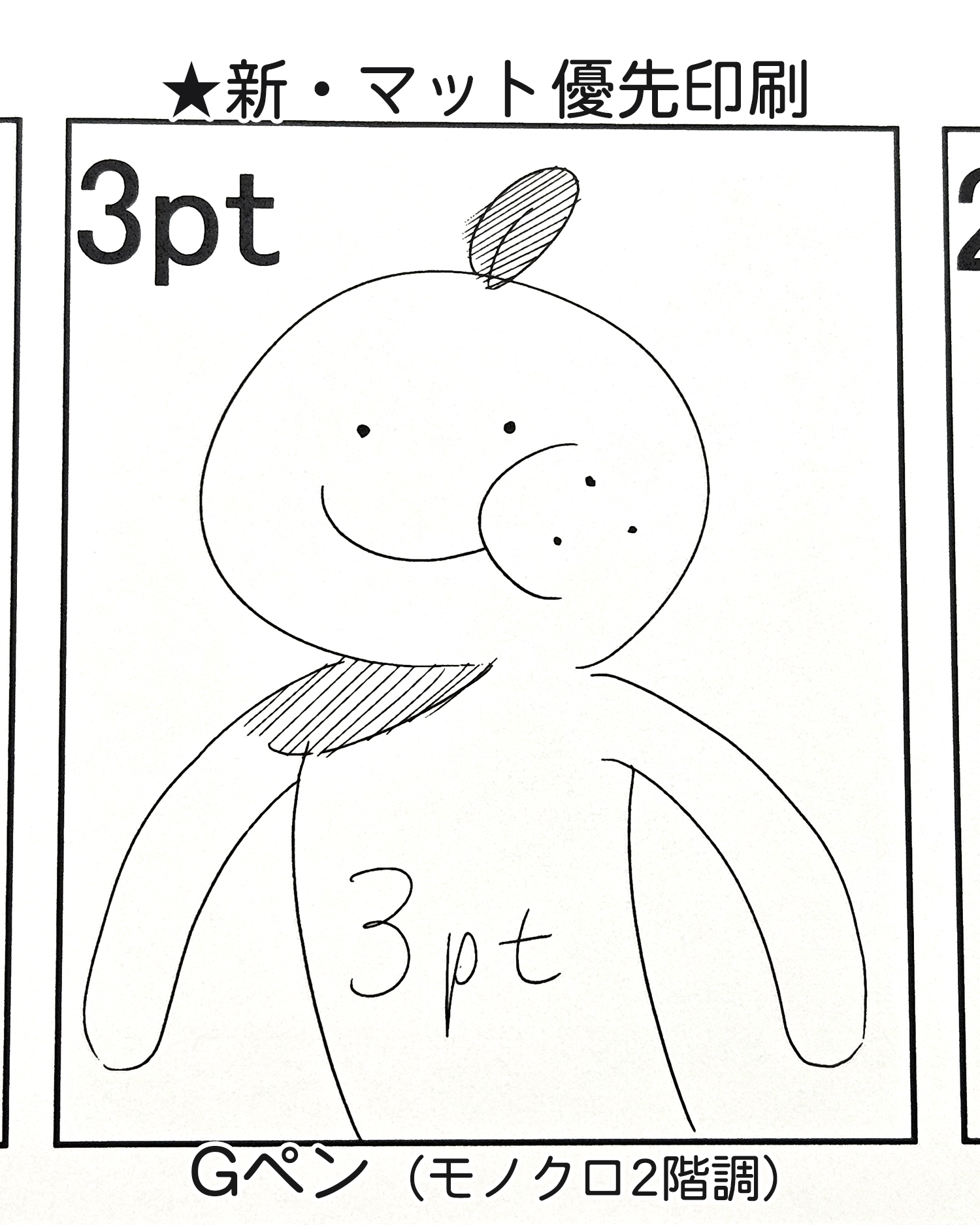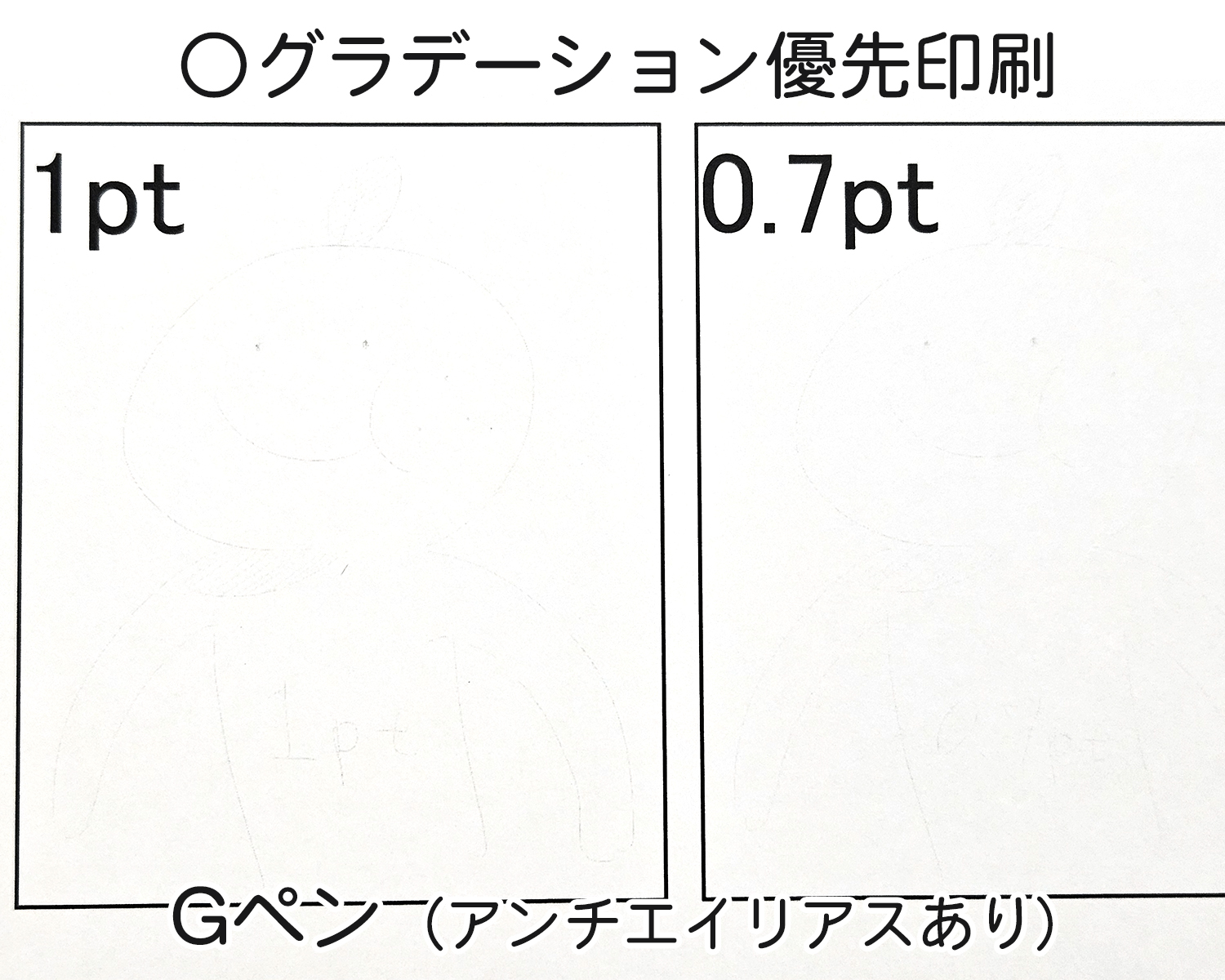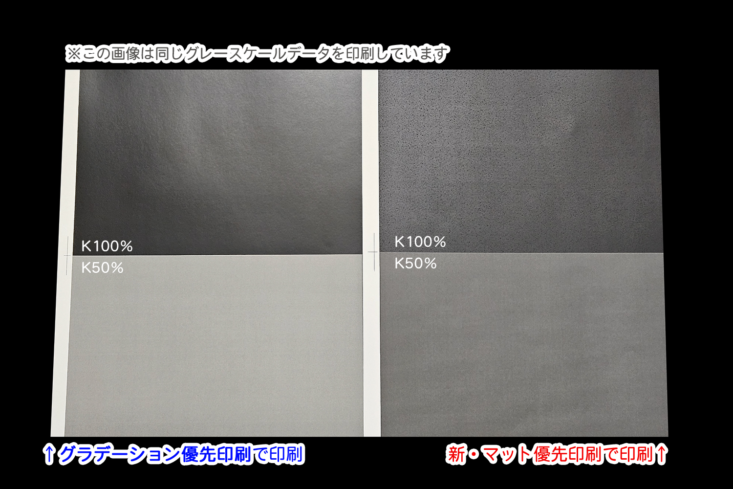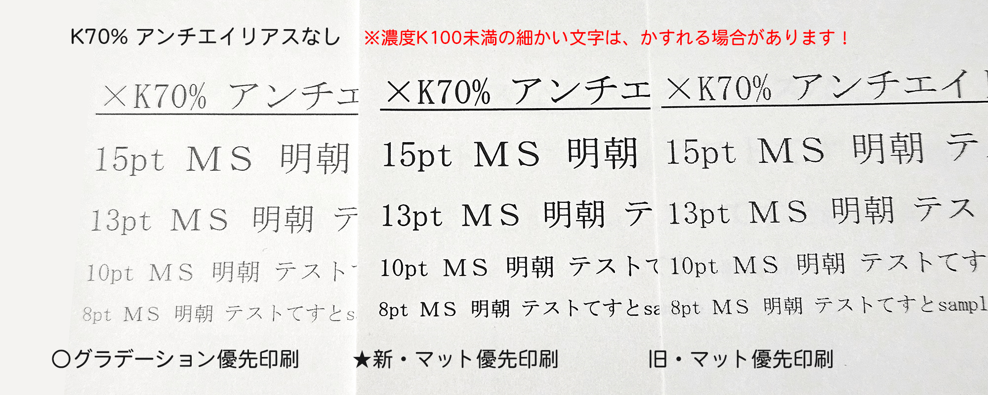 モノクロ2階調の原稿 ⇒ 印刷機の仕様による変化は、ほぼありません。 グレースケールの原稿 (×非推奨) ⇒ 印刷機の仕様により、旧マット優先で印刷した場合と比較して、仕上がりが大幅に変化します。 ※グレースケールを使用した原稿、アンチエイリアスのかかった線やトーンを使用した原稿などは、マット優先印刷非推奨です。