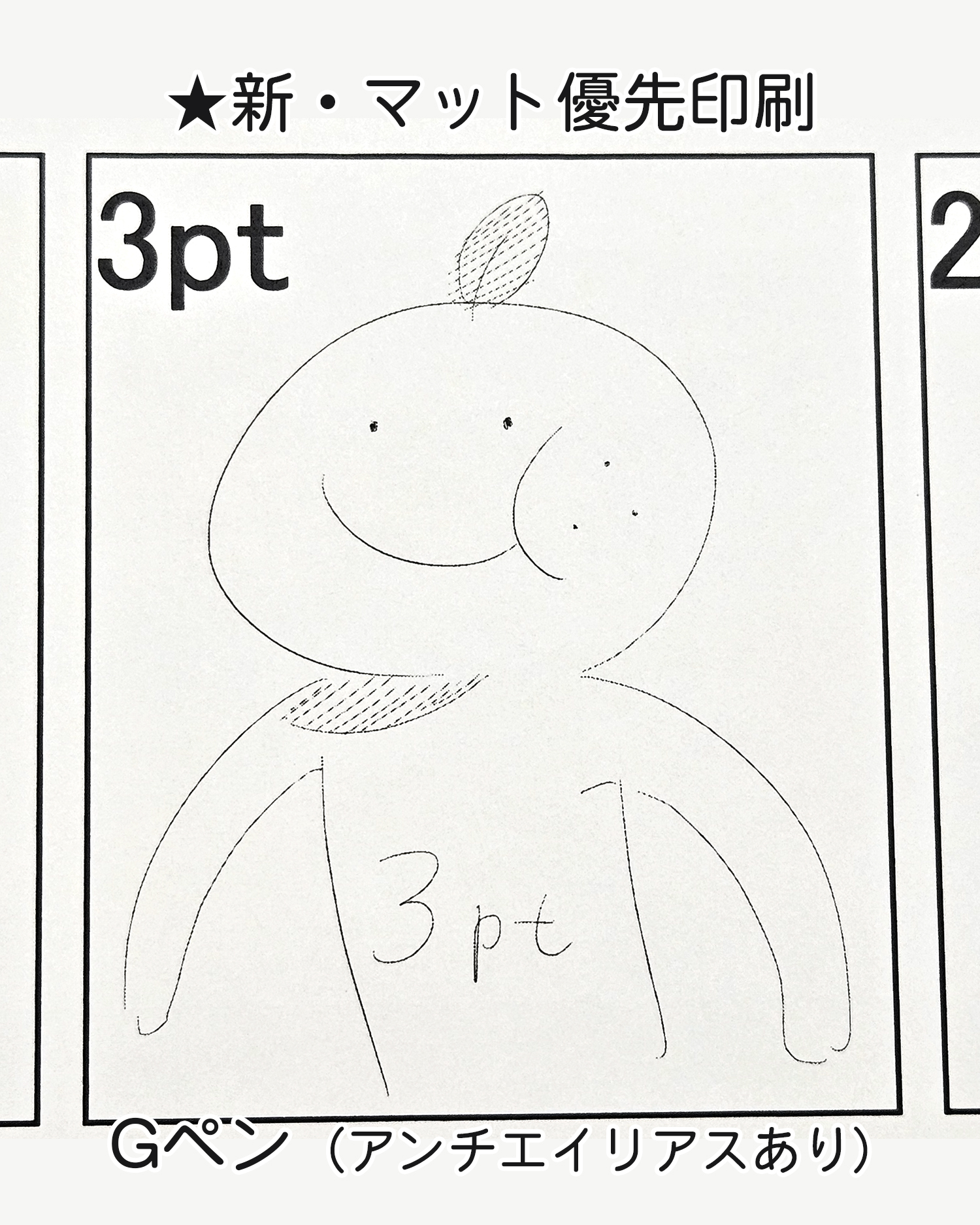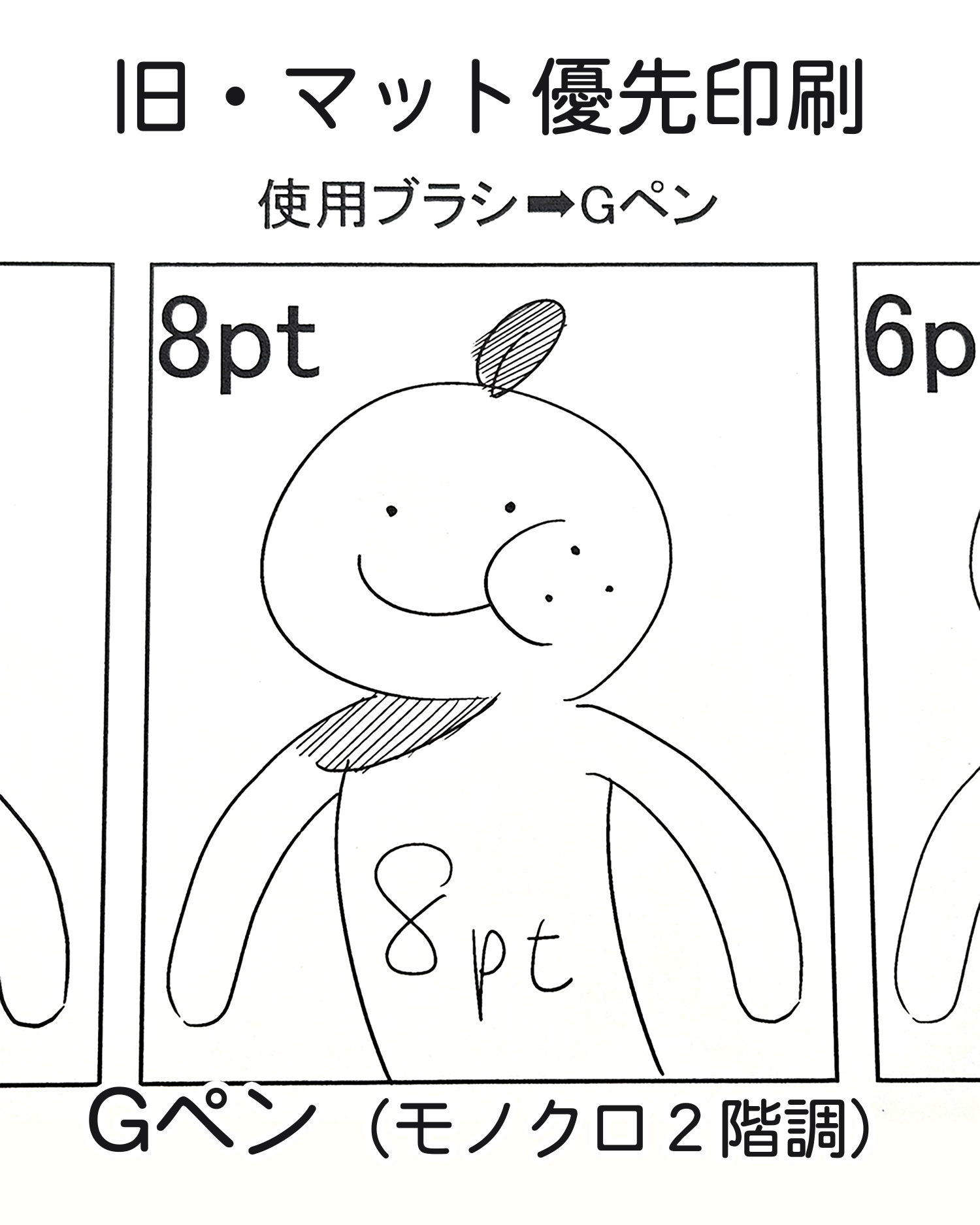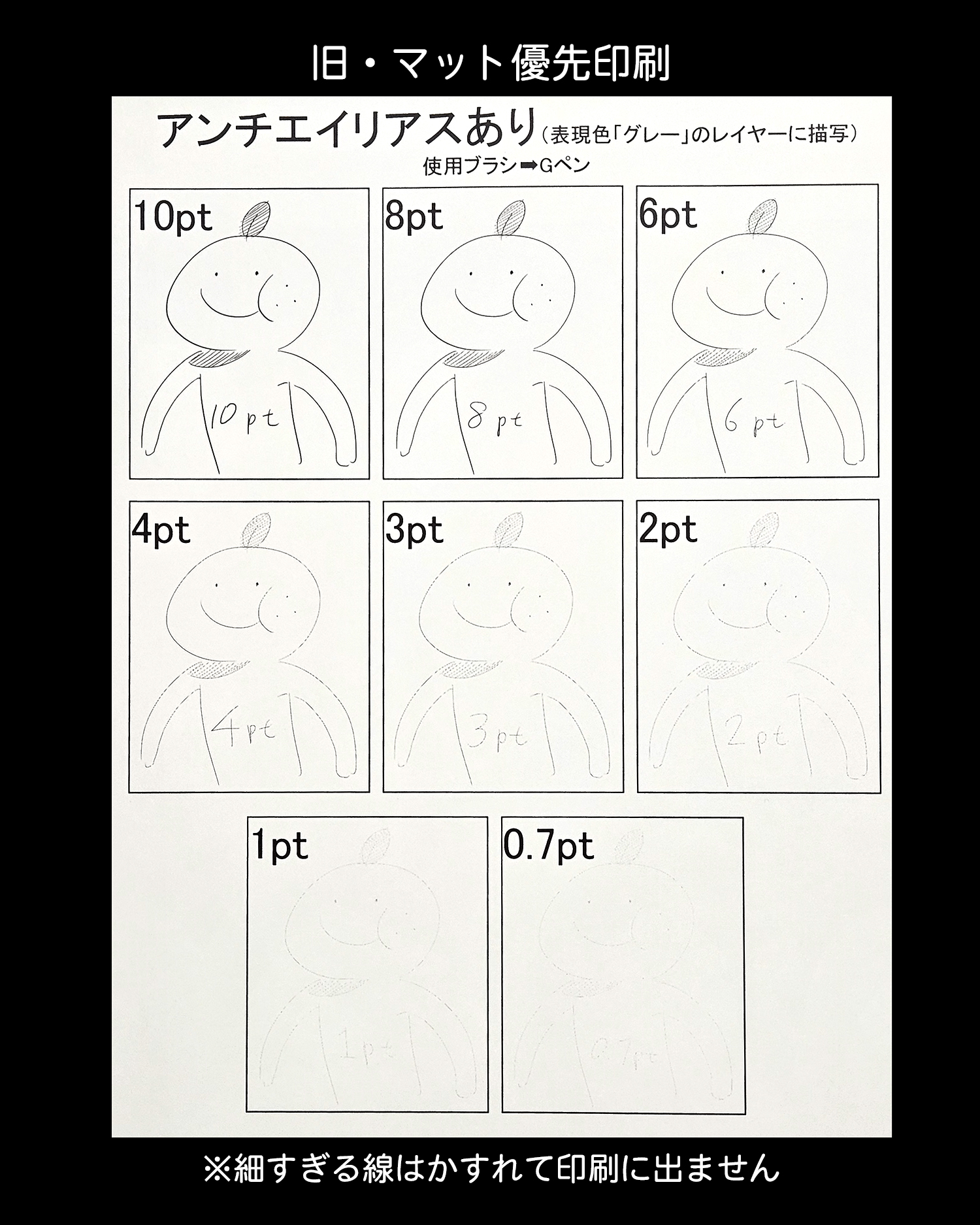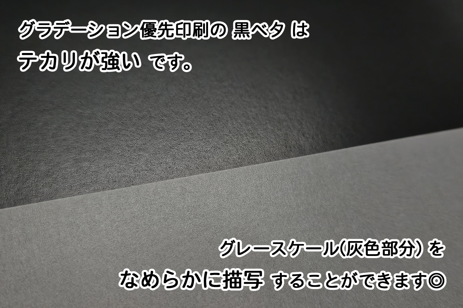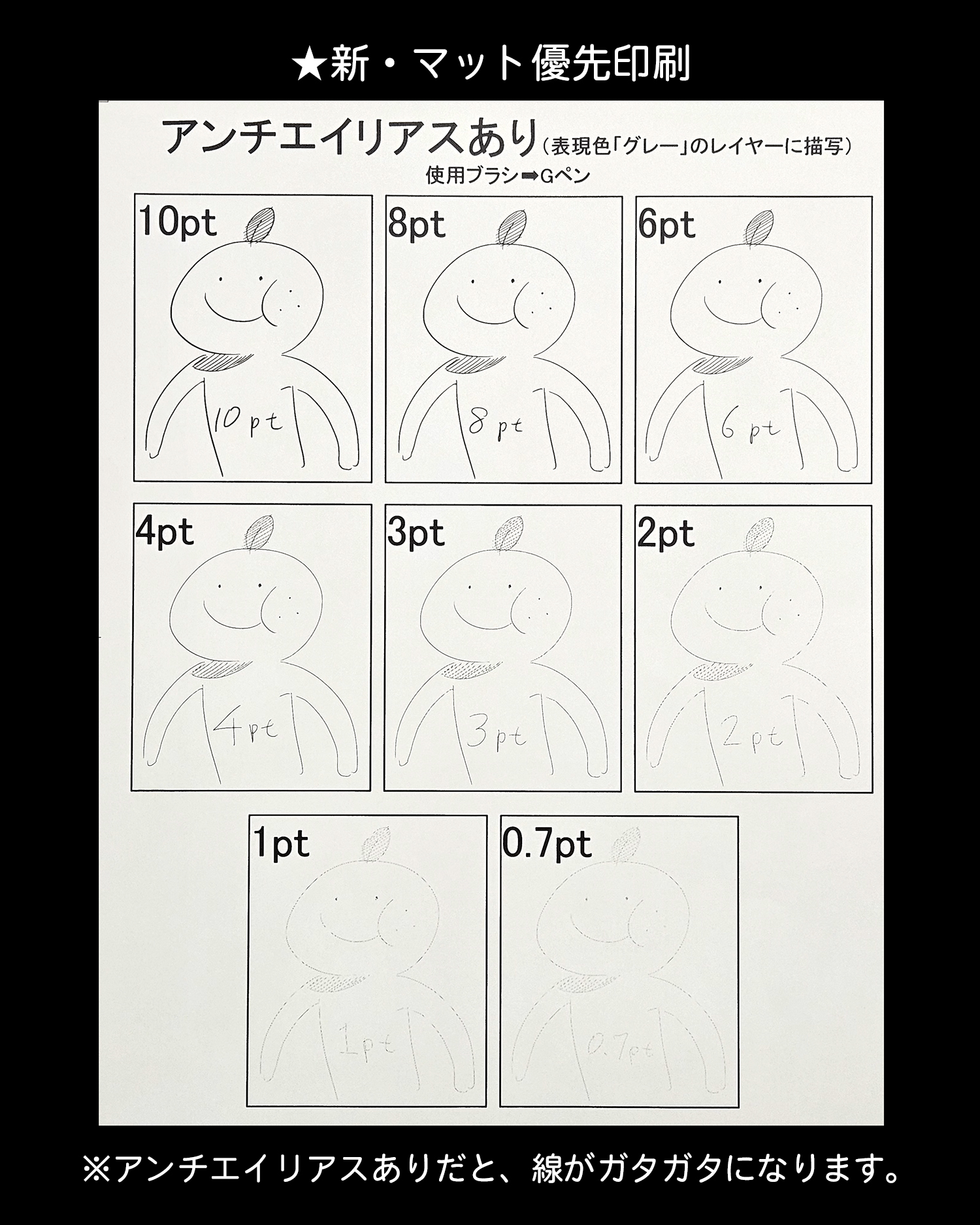 モノクロ2階調の原稿 ⇒ 印刷機の仕様による変化は、ほぼありません。 グレースケールの原稿 (×非推奨) ⇒ 印刷機の仕様により、旧マット優先で印刷した場合と比較して、仕上がりが大幅に変化します。 ※グレースケールを使用した原稿、アンチエイリアスのかかった線やトーンを使用した原稿などは、マット優先印刷非推奨です。