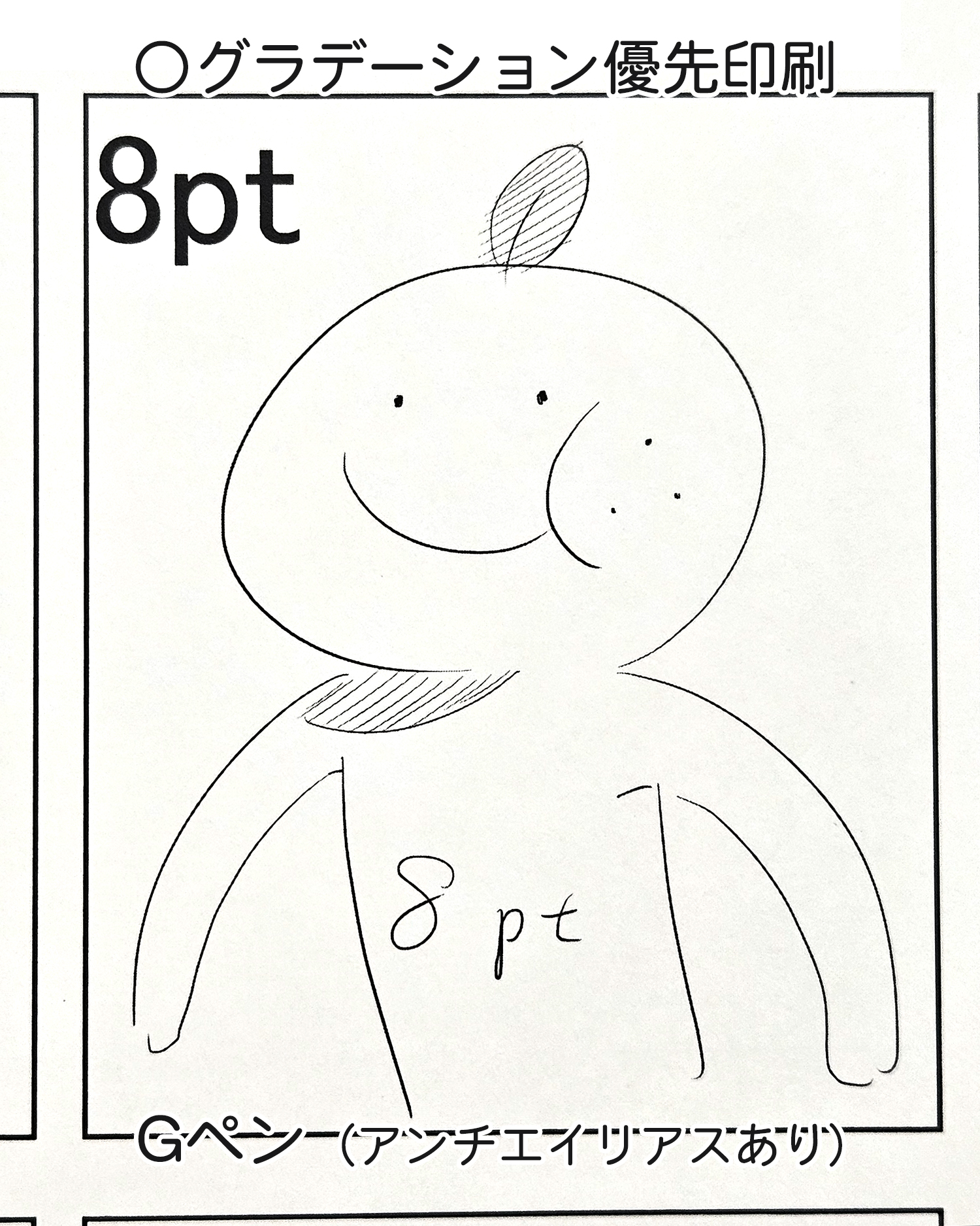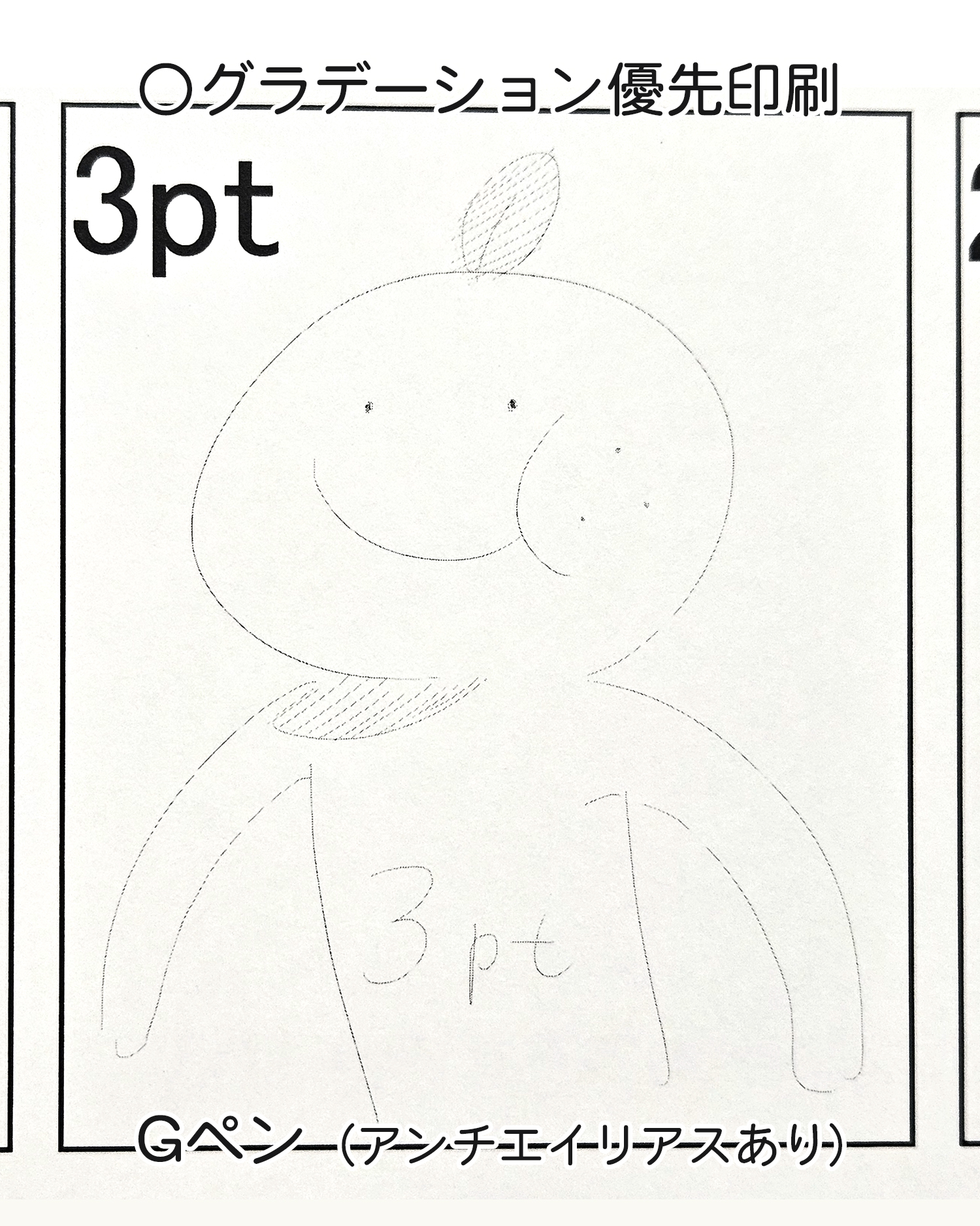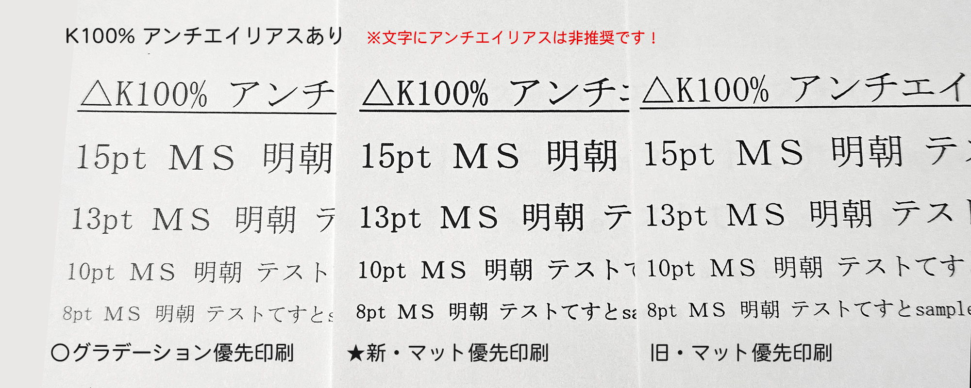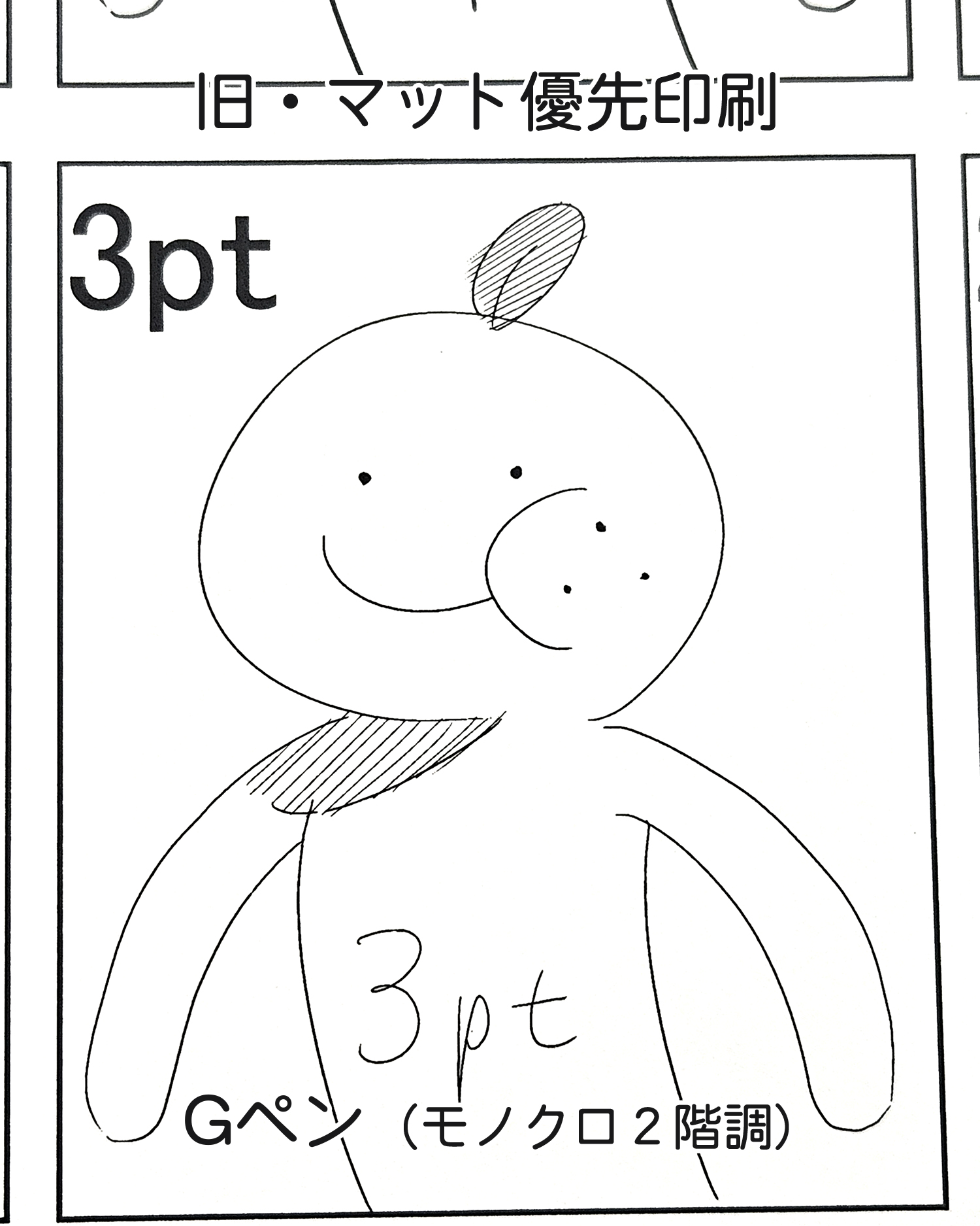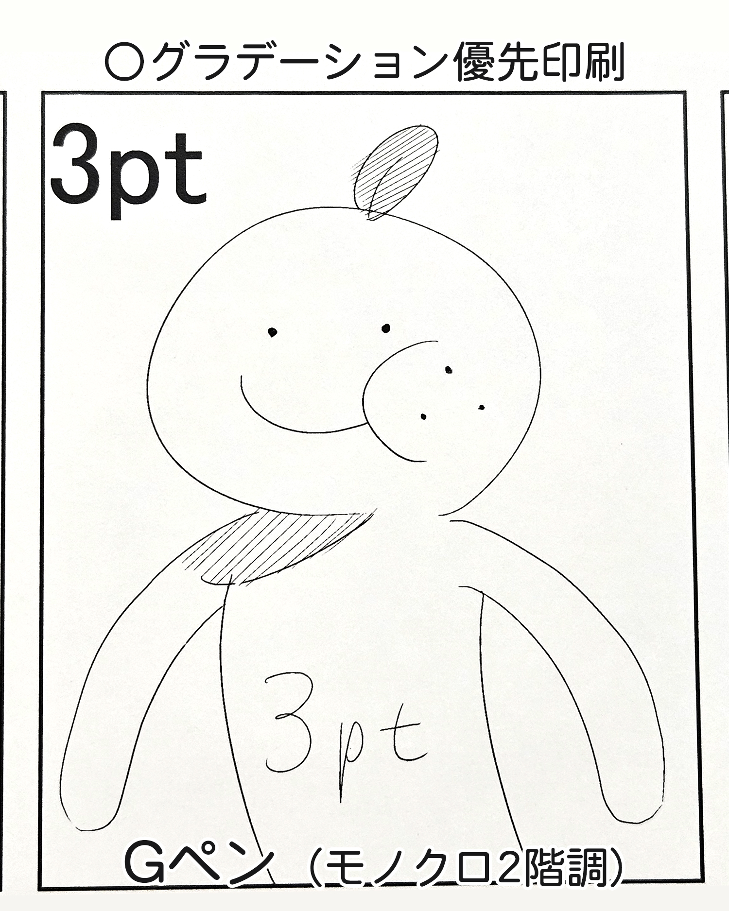 モノクロ2階調の原稿 ⇒ 印刷機の仕様による変化は、ほぼありません。 グレースケールの原稿 (×非推奨) ⇒ 印刷機の仕様により、旧マット優先で印刷した場合と比較して、仕上がりが大幅に変化します。 ※グレースケールを使用した原稿、アンチエイリアスのかかった線やトーンを使用した原稿などは、マット優先印刷非推奨です。